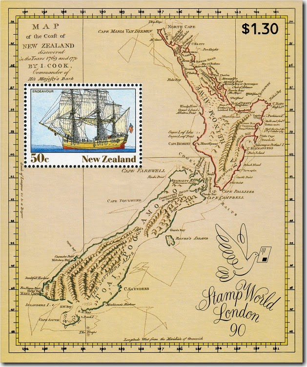 New Zealand Post attended the 1990 Stamp World Exhibition in London in May 1990. A miniature sheet was produced to commemorate the occasion incorporating the 50c 'Endeavour' stamp from the 'Heritage - the Ships' stamp issue, against a background design reproducing Captain Cook's early chart of New Zealand.