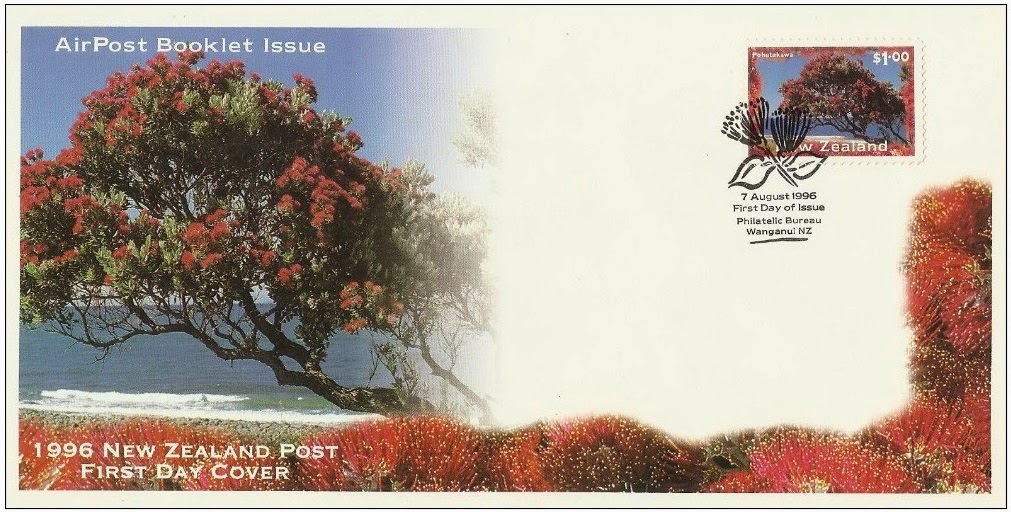 The AirPost booklet stamp featured a magnificent full-flowering Pohutukawa, commonly known as New Zealand's Christmas tree. The Pohutukawa (Metrosideros excelsa) grows naturally on the northern coastlines of Northland, Auckland, Coromandel, Bay of Plenty and East Cape but also does well when planted elsewhere. At full age it develops, in the words of noted botanist J.T. Salmon, into "a massive, often twisted and gnarled" tree. In December and January, the Pohutukawa is covered with brilliant masses of deep crimson to blood-red flowers which are the reason why it's often called New Zealand's Christmas Tree.