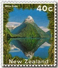 As you can see, Mitre Peak is truly one of New Zealand's finest landmarks. Mitre Peak has appeared five times on New Zealand stamps in the past 100 years, not surprising for it is truly one of the country's great landmarks. It rises abruptly to 1695 metres out of the deep black waters of Milford Sound in the heart of Fiordland National Park. The park is a land of ice age-created fiords, mountains, rainforest, waterfalls, lakes and rivers in the south-west corner of the South Island. The stamp shows one scene Mitre Peak is famous for, the reflections in the waters around its base.