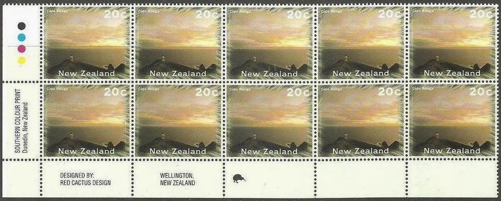 There are some interesting items worth noting on each of these plate blocks. First to the left to we find the four printers colour checks. These spots show each of the 4 colours used in printing these stamps. Below that, still on the left side is the printer, Southern Colour Print, Dunedin, New Zealand. In the first column across the bottom, we can see the designer, Red Cactus Design. Under the centre stamp, can be seen a little kiwi. The number of kiwis tells us how many reprints there as been. In this case, for all four values, it is the first print.