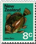 1970 Pictorial 8c John Dory, major black colour shift downwards plus paper crease in NEW of New Zealand on the left stamp.