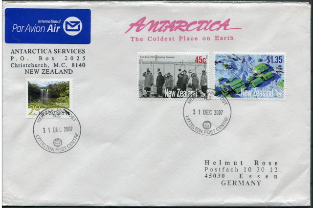 First Day Cover by local post, Universal Mail New Zealand Ltd. Notice the round Scott Base Anniversary cancel.