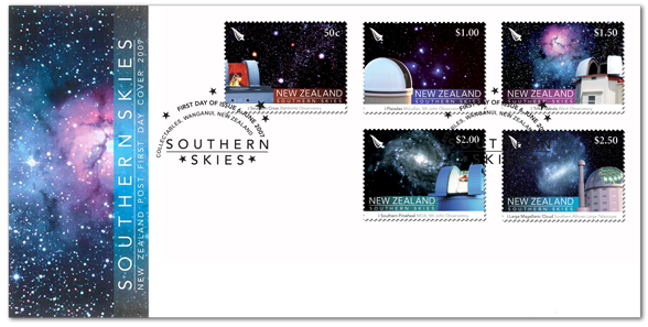 The 2007 Southern Skies was an issue of five stamps, each showing a scene from the night skies above New Zealand, set as a background to five famous astronomical telescopes.