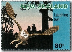 Once common throughout New Zealand, this owl made its last stand in the sub-alpine areas of the South Island's Southern Alps, where the final recorded sighting, a dead bird, was made in 1914. About twice the size of the morepork which hoots from the bush today, the laughing owl fed on large insects, small birds, lizards and bats and was also known to prey on rats and mice. With unusually long, powerful legs, it was apparently more adapted to hunting on the ground than most other owls.