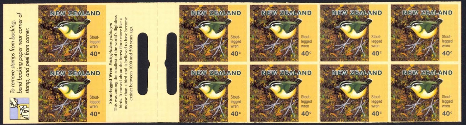 Denominations and designs: Sheet stamps: $0.40 Adzebill, $0.80 Laughing Owl, $1.00 Piopio, $1.20 Huia, $1.50 Giant Eagle, $1.80 Giant Moa; Self-adhesive booklet stamps: 10 x 40c Stout-legged wren; Miniature sheet: $1.80 Giant Moa.
