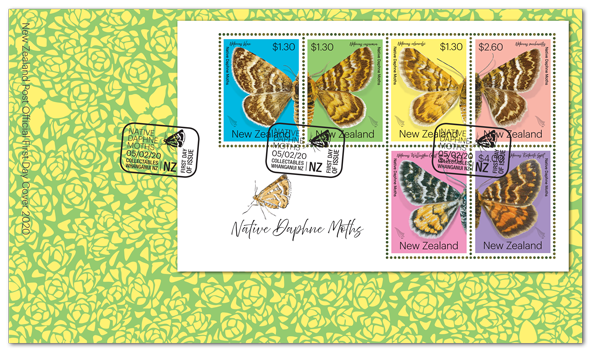 Discover the fascinating daphne moths of New Zealand with this presentation pack. With these vivid stamps designed by Wellington artist Stephen Fuller and commentary by moths and butterflies expert Brian Patrick, you’ll get an insight into six of the 35 species found around New Zealand. The pack comes with a full set of six gummed stamps, a miniature sheet and a first-day cover.