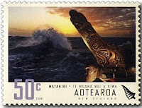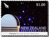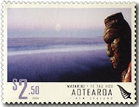 On the 6th June, 2007 New Zealand issued a set of five values showing stunning night-sky images provided as a lovely backdrop to a set of astronomical telescopes. The timing of this set is very close to the annual rising of Matariki, with the star cluster Pleiades actually appearing on the $1.00 value, so I have decided to include this as the first stamp in my Matariki collection.