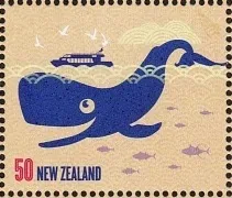 Off the east coast of the North Island the Marlin, an aggressive sporting fish, can be found. The stamp shows the Marlin jumping with a fishing boat in the background. This fish is very good eating, well worth the struggle it takes to catch one.