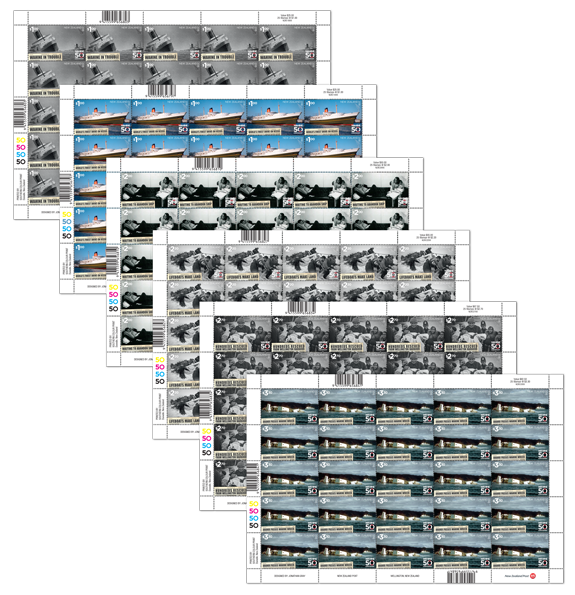 The first survivors began washing up on Seatoun foreshore, and others were plucked out of the water by boats waiting nearby. Most of those tossed into the waves were swept to Eastbourne’s rocky foreshore, where slips prevented rescuers reaching them quickly, and many suffered from being exposed to the harsh, deteriorating conditions. Many would ask how such a tragedy could occur right on the doorstep of the nation's capital. But it did and while the storm raged, many of the people in Wellington at the time went to watch the foundering of the Wahine unfold. News reports quickly spread across the country making this one of the most documented tragedies of our time. These stamps show the Wahine in all her glory and the sequence of how the day played out. The newspaper headings on each stamp are fictitious but acknowledge the role media played in telling the story.