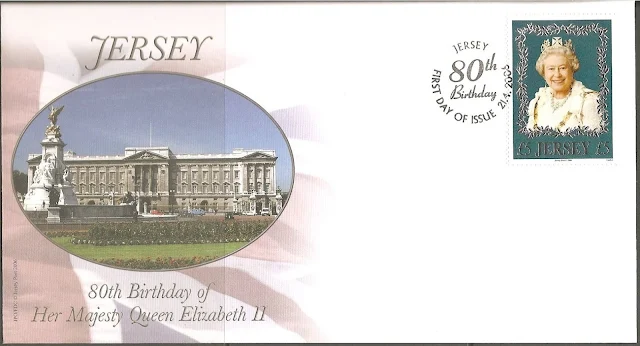 The Jersey first day cover has the £5 Jersey stamp with Buckingham Palace, the official residence of the Queen.