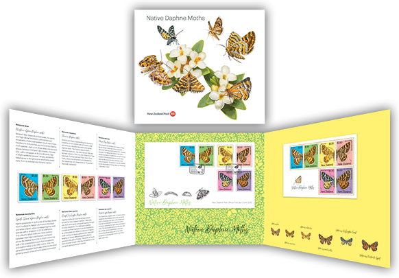 Discover the fascinating daphne moths of New Zealand with this presentation pack. With these vivid stamps designed by Wellington artist Stephen Fuller and commentary by moths and butterflies expert Brian Patrick, you’ll get an insight into six of the 35 species found around New Zealand. The pack comes with a full set of six gummed stamps, a miniature sheet and a first-day cover.